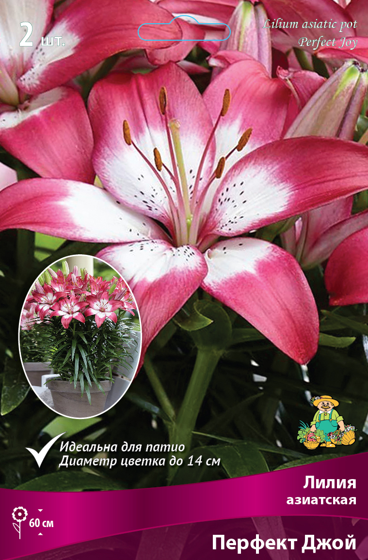 Лилии - многолетние травянистые, луковичные растения. Луковицы яйцевидной или округлой формы, 2-20см в диаметре, состоящие из отдельных сочных, незамкнутых чешуи, прилегающих друг к другу более или менее плотно. Стебли прямые, густо облиственные, зеленые, темно-пурпуровые или с темно-коричневыми штрихами, высотой 30-250см. У отдельных видов на стеблях, в пазухах листьев развиваются воздушные луковички — бульбочки, которые используют для размножения. Листья сидячие или черешковые, от 2-3 до 20см длиной, расположены в очередном порядке, реже мутовчато. Цветки одиночные или собраны по 2-4 в пирамидальные или зонтиковидные соцветия. Окраска белая, красная, оранжевая, розовая, сиреневая или желтая, большей частью с крапинками, полосками или пятнышками на внутренней стороне листочков околоцветника. Месторасположение: предпочитают солнечные, теплые, слегка затененные места. Почва: любая хорошо дренированная почва, богатая питательными веществами, рыхлая, песчано-глинистая, известкованная. Посадка: Срок осенней посадки - август-сентябрь, весенней – конец апреля-май. Размножение: клубнелуковицами и семенами. Использование: в групповых посадках, миксбордерах, клумбах, на срезку. Азиатские Горшечные – низкорослые сорта, для выращивания в комнате, на балконе. Высота до 45 см. Перфект Джой - красно-розовый с белым центром и редким темно-розовым крапом, диаметр цветка 14 см Зона зимостойкости: 3 зона (-34,5/-39,9'C)