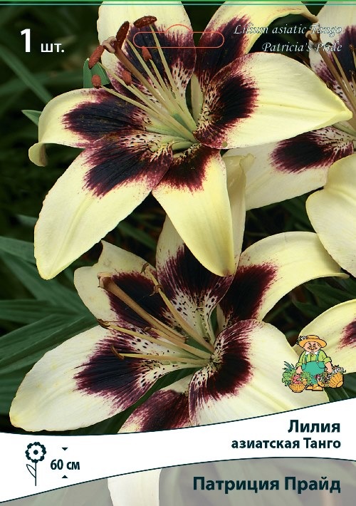 Лилии - многолетние травянистые, луковичные растения. Луковицы яйцевидной или округлой формы, 2-20см в диаметре, состоящие из отдельных сочных, незамкнутых чешуи, прилегающих друг к другу более или менее плотно. Стебли прямые, густо облиственные, зеленые, темно-пурпуровые или с темно-коричневыми штрихами, высотой 30-250см. У отдельных видов на стеблях, в пазухах листьев развиваются воздушные луковички — бульбочки, которые используют для размножения. Листья сидячие или черешковые, от 2-3 до 20см длиной, расположены в очередном порядке, реже мутовчато. Цветки одиночные или собраны по 2-4 в пирамидальные или зонтиковидные соцветия. Окраска белая, красная, оранжевая, розовая, сиреневая или желтая, большей частью с крапинками, полосками или пятнышками на внутренней стороне листочков околоцветника. Месторасположение: предпочитают солнечные, теплые, слегка затененные места. Почва: любая хорошо дренированная почва, богатая питательными веществами, рыхлая, песчано-глинистая, известкованная. Посадка: в сентябре, на глубину 15-20см. Размножение: клубнелуковицами и семенами. Использование: в групповых посадках, миксбордерах, клумбах, на срезку. Азиатские гибриды – самый многочисленный раздел, объединяющий более 2000 сортов, перспективных для выращивания повсеместно. Они довольно неприхотливы, отличаются морозостойкостью, быстро и легко размножаются. Цветки разнообразны по форме и окраске. Цветут во второй половине июня-июле. Пригодны для выгонки во внесезонное время. Патриция Прайд- высота растения 60см, цветок кремово-белый, в центре насыщенно-бордовый.