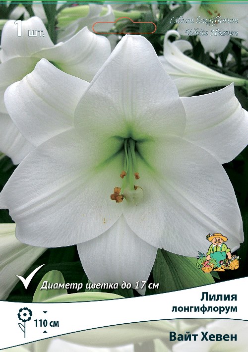 Лилии - многолетние травянистые, луковичные растения. Луковицы яйцевидной или округлой формы, 2-20см в диаметре, состоящие из отдельных сочных, незамкнутых чешуи, прилегающих друг к другу более или менее плотно. Стебли прямые, густо облиственные, зеленые, темно-пурпуровые или с темно-коричневыми штрихами, высотой 30-250см. У отдельных видов на стеблях, в пазухах листьев развиваются воздушные луковички — бульбочки, которые используют для размножения. Листья сидячие или черешковые, от 2-3 до 20см длиной, расположены в очередном порядке, реже мутовчато. Цветки одиночные или собраны по 2-4 в пирамидальные или зонтиковидные соцветия. Окраска белая, красная, оранжевая, розовая, сиреневая или желтая, большей частью с крапинками, полосками или пятнышками на внутренней стороне листочков околоцветника. Месторасположение: предпочитают солнечные, теплые, слегка затененные места. Почва: любая хорошо дренированная почва, богатая питательными веществами, рыхлая, песчано-глинистая, известкованная. Посадка: в сентябре, на глубину 15-20см. Размножение: клубнелуковицами и семенами. Использование: в групповых посадках, миксбордерах, клумбах, на срезку. Длинноцветковые (Лонгифлорум) гибриды – сортов в этом разделе немного. В наших условиях они не зимостойки, в основном их выращивают в теплицах и оранжереях на срезку. Вайт Хевен- высота растения 110см, цветок белый с зеленцой у основания.