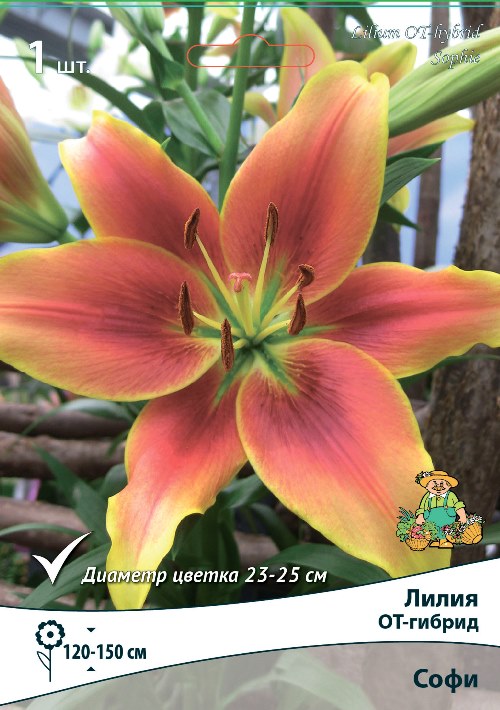 Лилии - многолетние луковичные растения. Высота у разных видов от 30 до 200 см. Есть сорта для выращивания в горшках. Месторасположение: Предпочитают солнечные или слегка затенённые места. Почва: любая хорошо дренированная почва, богатая питательными веществами, рыхлая, песчано-глинистая, известкованная. Посадка: Срок осенней посадки - август-сентябрь, весенней – конец апреля-май. Глубина посадки – 10-15 см. На одном месте могут расти от 3 до 5 лет. Уход за растениями заключается в поддержании почвы во влажном, рыхлом состоянии, проведении подкормок. Хорошо замульчировать посадки. Большинство видов лилий не требует выкопки на зиму. Использование: в групповых посадках, миксбордерах, клумбах, на срезку. ОТ-гибриды – необыкновенные по красоте лилии. Получены в результате скрещиваний между лилиями восточной и трубчатой и их гибридами. Растения обладают прочными, крепкими побегами. Цветки очень крупные (20-25 см в диаметре), широкочашевидной или воронковидной формы, направлены вверх или в сторону. Массовое цветение начинается во второй половине июля. Широко применяются для круглогодичной выгонки, дают прекрасную срезку, хорошо переносят транспортировку, подходят для выращивания в открытом грунте. На зиму требуют укрытия. Софи - высота растения 150 см. Цветок КРУПНЫЙ, рубиновый с широким желтым кантом, диаметр цветка 23 см. Зона зимостойкости: 4 зона ( -29,4/-34,4'C)