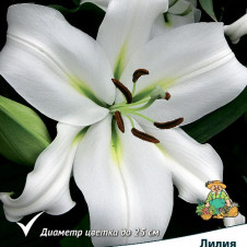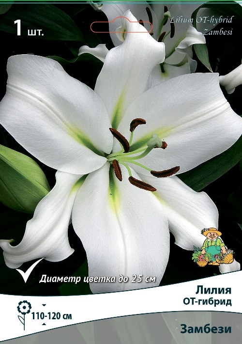 Лилии - многолетние луковичные растения. Высота у разных видов от 30 до 200 см. Есть сорта для выращивания в горшках. Месторасположение: Предпочитают солнечные или слегка затенённые места. Почва: любая хорошо дренированная почва, богатая питательными веществами, рыхлая, песчано-глинистая, известкованная. Посадка: Срок осенней посадки - август-сентябрь, весенней – конец апреля-май. Глубина посадки – 10-15 см. На одном месте могут расти от 3 до 5 лет. Уход за растениями заключается в поддержании почвы во влажном, рыхлом состоянии, проведении подкормок. Хорошо замульчировать посадки. Большинство видов лилий не требует выкопки на зиму. Использование: в групповых посадках, миксбордерах, клумбах, на срезку. ОТ-гибриды – необыкновенные по красоте лилии. Получены в результате скрещиваний между лилиями восточной и трубчатой и их гибридами. Растения обладают прочными, крепкими побегами. Цветки очень крупные (20-25 см в диаметре), широкочашевидной или воронковидной формы, направлены вверх или в сторону. Массовое цветение начинается во второй половине июля. Широко применяются для круглогодичной выгонки, дают прекрасную срезку, хорошо переносят транспортировку, подходят для выращивания в открытом грунте. На зиму требуют укрытия. Замбези - высота растения 110-120 см. Цветок КРУПНЫЙ, белые волнистые лепестки и оранжевые пыльники, диаметр цветка 25 см. Зона зимостойкости: 4 зона ( -29,4/-34,4'C)