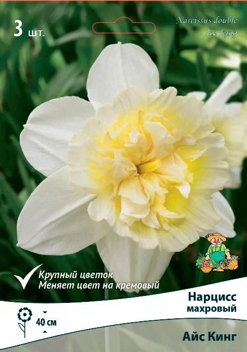 Махровые нарциссы – сорта этой группы выделяются махровыми цветками от одного до нескольких на цветоносе. Это самая популярная группа в любительском садоводстве. Махровые сорта отличаются формой цветков, их размерами и окраской. Высота растений от 15 до 45см. Айс Кинг - высота растения 40 см, цветок белый с нежно-желтым центром. Месторасположение: нарциссы - культура более теневыносливая по сравнению, например, с тюльпанами, но на освещенных местах “урожай” их цветков и луковиц значительно выше, чем в тени. Почва: мирятся с любой почвой, при условии, что она хорошо дренирована и плодородна. На одном месте могут оставаться 3-5 лет. Посадка: высаживать луковицы следует на глубину 15-20см на расстоянии 10-12см друг от друга. Лучшее время для посадки луковиц нарциссов август - начало сентября. Если придерживаться этих сроков посадки, луковицы до морозов хорошо укореняются. Пересаживать их следует тогда, когда они сильно разрастаются, образуя большие гнезда луковиц, и начинают угнетать друг друга. Размножение: размножаются сортовые нарциссы только вегетативно. Использование: широко используются в озеленении как раноцветущие растения, в клумбах, рабатках, группах между кустарниками, отдельными пятнами.