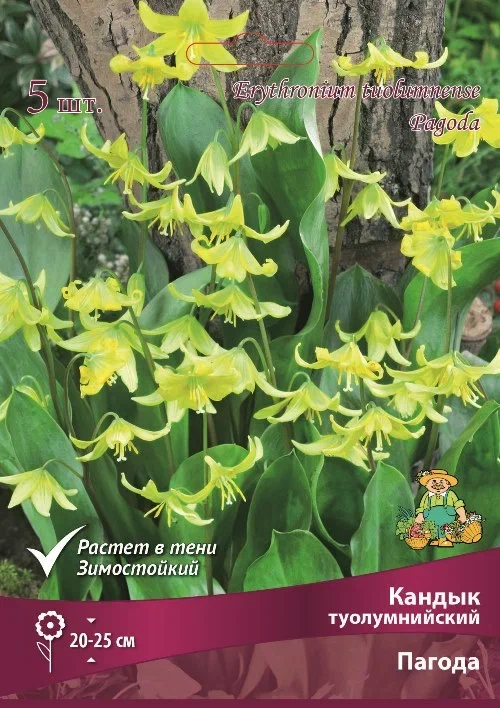 Кандык или эритрониум – редкое для наших садов луковичное растение. Цветки по форме напоминают тигровые лилии или цикламены. Садоводы любят их за неприхотливость, морозостойкость и долговечность. Пагода - высота растения 20-25 см. Цветки поникающие, желтой окраски. Посадка. Предпочитает затенение, можно высаживать под кронами деревьев или с северной стороны построек. Участок надо выбирать без застоя воды. Почвы нужны легкие, влажные и торфянистые с кислой реакцией. Высаживают группами по 3-5 штук: такая куртинка очень декоративна во время цветения. После посадки следует присыпать мульчирующим материалом. Уход. Растения отзывчивы на подкормки. Ранней весной, по снегу, можно внести калийную селитру, суперфосфат. Затем подкормить еще 2 раза комплексным удобрением. На одном месте кандык может расти до 6-10 лет. За это время каждая луковица образует до 20 дочерних. Кандык прекрасно смотрится в весенних композициях с другими луковичными не только благодаря своей декоративности, но и продолжительности цветения: кандык цветет в течение 2-3 недель. В начале лета надземные побеги отмирают. Хорош в альпинарии, на газоне, красив в букетах. Пригоден для выгонки. Зимует без укрытия.