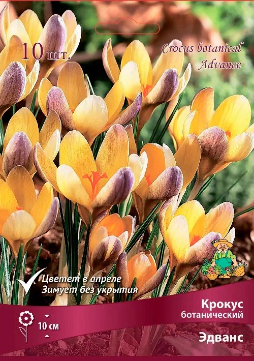 Эдванс - цветки желтые с сиреневым, высота растения 10 см.Месторасположение: хорошо развиваются на освещенных, прогреваемых солнцем местах. В тени цветки не раскрываются полностью. Почва: предпочитают рыхлые водопроницаемые питательные почвы. Посадка: Лучшее время для посадки - август-сентябрь, когда растения находятся в покое. Сажают луковицы по общему правилу: если в рыхлую почву, то на глубину, равную двум луковицам, если в тяжелую - на глубину одной. Но в любом случае не мельче чем на 5см. Цветение: март - апрель Размножение: делением разросшихся гнезд клубнелуковиц осенью. Использование: эффектны в групповых посадках, бордюрах, рабатках, на каменистых участках.