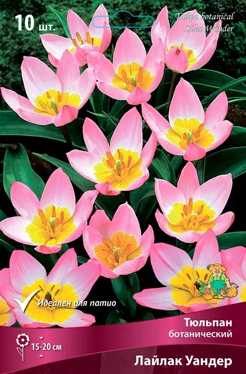 Ботанические тюльпаны - воплощение природной естественной красоты. Это один из 15 классов тюльпанов, в котором объеденены все дикорастущие разновидности разных форм и окрасок. Все ботанические тюльпаны отличаются невысоким ростом и очень ранним цветением. Эта особенность позволяет использовать их для создания цветочных композиций в альпинариях и цветниках , высаживая на передний план. В уходе неприхотливы, но следует помнить, что с каждым годом луковица уходит всё глубже в землю, и становится мельче, поэтому через 3-4 года любой сорт нужно выкапывать и рассаживать, чтобы сохранить его (луковицы дикорастущих ботанических тюльпанов могут находиться на глубине до 30 см). После выкопки их следует просушить в тени и хранить до посадки в прохладном сухом помещении. Лайлак Уандер - высота растения 15-20 см, цветок нежно-сиренево-розовый, лимонно-желтый у основания. Местоположение: участок должен быть расположен в солнечном месте и защищен от ветра. Важно, чтобы он не имел неровностей, в которых весной и осень будет застаиваться вода - это может привести к вымоканию и загниванию луковиц. Почва: тюльпаны - растения довольно неприхотливые и могут мириться с любой садовой почвой, но наилучшей для них является рыхлая, хорошо дренированная, умеренно увлажненная, т.е. суглинистая и супесчаная почва с нейтральной или слабощелочной реакцией. Тяжелую суглинистую почву можно улучшить добавлением песка и торфа. Посадка: тюльпаны высаживают осенью, когда температура почвы на глубине 10 см опустится до 9-10°С, в средней полосе это вторая половина сентября - начало октября. Глубина посадки для садовых тюльпанов – 15-20 см, ботанических -10 см. Расстояние между растениями 10-20 см. Луковицы садовых тюльпанов нужно выкапывать каждый год. Место посадки тюльпанов лучше менять 1 раз в 4-5 лет. Использование: для озеленения, на срезку.