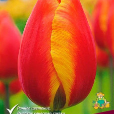 Тюльпаны - многолетние травянистые луковичные растения семейства лилейных. Они заслуженно пользуются широкой популярностью и распространены во всех странах с умеренным климатом. Тюльпаны являются наиболее красивоцветущими среди весенних цветов и к тому же относительно неприхотливы в культуре. Дарвиновы гибриды - растения этого класса отличаются очень крупными размерами: в высоту они достигают 60- 80 см, а диаметр цветков некоторых сортов может превышать 10 см. Тюльпаны этого класса имеют крупные бокаловидные цветы, преимущественно красного цвета, но в настоящее время их вытесняют сорта с двухцветной окраской. Фиолетовые тона в окраске этих тюльпанов отсутствуют. Цветут в начале мая. Сорта этого класса отличаются высоким коэффициентом размножения. Недостатком Дарвиновых гибридов считается сильное раскрывание цветов, как у мака, особенно в жаркую, солнечную погоду. Многие сорта внешне очень похожи. Но есть у них и определенные преимущества - цветы хорошо переносят весенние заморозки, устойчивы к вирусу пестролепестности, длительное время сохраняются в срезке. Их применяют для оформления участков, для выгонки в феврале - марте, а срезка тюльпанов этого класса отличается высоким качеством. Местоположение: участок должен быть расположен в солнечном месте и защищен от ветра. Важно, чтобы он не имел неровностей, в которых весной и осень будет застаиваться вода - это может привести к вымоканию и загниванию луковиц. Почва: тюльпаны - растения довольно неприхотливые и могут мириться с любой садовой почвой, но наилучшей для них является рыхлая, хорошо дренированная, умеренно увлажненная, т.е. суглинистая и супесчаная почва с нейтральной или слабощелочной реакцией. Тяжелую суглинистую почву можно улучшить добавлением песка и торфа. Посадка: тюльпаны высаживают осенью, когда температура почвы на глубине 10 см опустится до 9-10°С, в средней полосе это вторая половина сентября - начало октября. Глубина посадки для садовых тюльпанов – 15-20 см, ботанических -10 см. Расстояние между растениями 10-20 см. Луковицы садовых тюльпанов нужно выкапывать каждый год. Место посадки тюльпанов лучше менять 1 раз в 4-5 лет. Использование: для озеленения, на срезку. Апельдорн Элит - высота растения 55 см, цветок красный с желтой каймой.