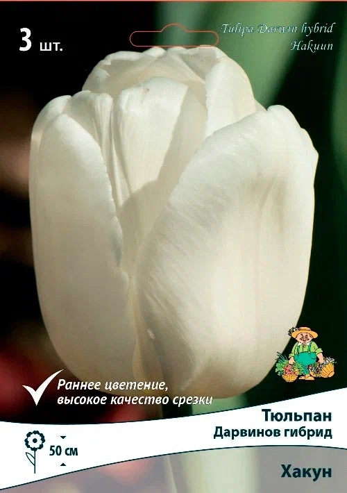 Дарвиновы гибриды - растения этого класса отличаются очень крупными размерами: в высоту они достигают 60- 80 см, а диаметр цветков некоторых сортов может превышать 10 см. Тюльпаны этого класса имеют крупные бокаловидные цветы, преимущественно красного цвета, но в настоящее время их вытесняют сорта с двухцветной окраской. Фиолетовые тона в окраске этих тюльпанов отсутствуют. Цветут в начале мая. Сорта этого класса отличаются высоким коэффициентом размножения. Недостатком Дарвиновых гибридов считается сильное раскрывание цветов, как у мака, особенно в жаркую, солнечную погоду. Многие сорта внешне очень похожи. Но есть у них и определенные преимущества - цветы хорошо переносят весенние заморозки, устойчивы к вирусу пестролепестности, длительное время сохраняются в срезке. Их применяют для оформления участков, для выгонки в феврале - марте, а срезка тюльпанов этого класса отличается высоким качеством. Хакун - высота растения 50 см, цветок белый. Местоположение: участок должен быть расположен в солнечном месте и защищен от ветра. Важно, чтобы он не имел неровностей, в которых весной и осень будет застаиваться вода - это может привести к вымоканию и загниванию луковиц. Почва: тюльпаны - растения довольно неприхотливые и могут мириться с любой садовой почвой, но наилучшей для них является рыхлая, хорошо дренированная, умеренно увлажненная, т.е. суглинистая и супесчаная почва с нейтральной или слабощелочной реакцией. Тяжелую суглинистую почву можно улучшить добавлением песка и торфа. Посадка: тюльпаны высаживают осенью, когда температура почвы на глубине 10 см опустится до 9-10°С, в средней полосе это вторая половина сентября - начало октября. Глубина посадки для садовых тюльпанов – 15-20 см, ботанических -10 см. Расстояние между растениями 10-20 см. Луковицы садовых тюльпанов нужно выкапывать каждый год. Место посадки тюльпанов лучше менять 1 раз в 4-5 лет. Использование: для озеленения, на срезку.