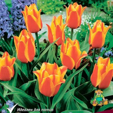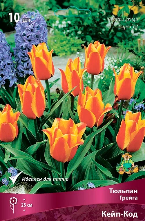 Тюльпаны - многолетние травянистые луковичные растения семейства лилейных. Они заслуженно пользуются широкой популярностью и распространены во всех странах с умеренным климатом. Тюльпаны являются наиболее красивоцветущими среди весенних цветов и к тому же относительно неприхотливы в культуре. Тюльпаны Грейга - в этот класс вошли тюльпаны Грейга, их гибриды с тюльпанами Фостера, Кауфмана и другими тюльпанами. Тюльпаны Грейга довольно низкорослы (20-35 см), имеют крупные цветки с широким основанием и слегка отогнутыми наружу кончиками лепестков. Окраска цветков преимущественно красных тонов, оранжевая или двухцветная. Тюльпаны Грейга имеют характерные для них декоративные крапчатые листья. Цветут они вслед за тюльпанами Кауфмана, в конце апреля - начале мая, их цветы долго не увядают. Используют их также, как и тюльпаны Фостера и Кауфмана — для выращивания в садах, в бордюрах, на альпийских горках и т.п. Местоположение: участок должен быть расположен в солнечном месте и защищен от ветра. Важно, чтобы он не имел неровностей, в которых весной и осень будет застаиваться вода - это может привести к вымоканию и загниванию луковиц. Почва: тюльпаны - растения довольно неприхотливые и могут мириться с любой садовой почвой, но наилучшей для них является рыхлая, хорошо дренированная, умеренно увлажненная, т.е. суглинистая и супесчаная почва с нейтральной или слабощелочной реакцией. Тяжелую суглинистую почву можно улучшить добавлением песка и торфа. Посадка: тюльпаны высаживают осенью, когда температура почвы на глубине 10 см опустится до 9-10°С, в средней полосе это вторая половина сентября - начало октября. Глубина посадки для садовых тюльпанов – 15-20 см, ботанических -10 см. Расстояние между растениями 10-20 см. Луковицы садовых тюльпанов нужно выкапывать каждый год. Место посадки тюльпанов лучше менять 1 раз в 4-5 лет. Использование: для озеленения, на срезку. Кейп Код - высота растения 25 см, цветок красный с желтым.