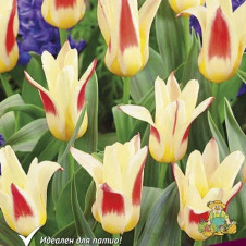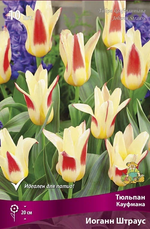 Тюльпаны - многолетние травянистые луковичные растения семейства лилейных. Они заслуженно пользуются широкой популярностью и распространены во всех странах с умеренным климатом. Тюльпаны являются наиболее красивоцветущими среди весенних цветов и к тому же относительно неприхотливы в культуре. Тюльпаны Кауфмана - эти тюльпаны отличаются самыми ранними сроками цветения (иногда уже в начале апреля), устойчивостью к пестролепестности и небольшой высотой (15-25см). Цветки у тюльпанов Кауфмана довольно крупные, удлиненные, а в полностью раскрытом состоянии - звездчатые. Окраска может быть самой разнообразной: красной, желтой, розовой, чаще бывает двухцветной. Листья многих тюльпанов Кауфмана - с пурпурными полосами и крапинами. Используются, главным образом, для выращивания на альпийских горках, в рокариях, для высадки в бордюрах и под деревьями. Местоположение: участок должен быть расположен в солнечном месте и защищен от ветра. Важно, чтобы он не имел неровностей, в которых весной и осень будет застаиваться вода - это может привести к вымоканию и загниванию луковиц. Почва: тюльпаны - растения довольно неприхотливые и могут мириться с любой садовой почвой, но наилучшей для них является рыхлая, хорошо дренированная, умеренно увлажненная, т.е. суглинистая и супесчаная почва с нейтральной или слабощелочной реакцией. Тяжелую суглинистую почву можно улучшить добавлением песка и торфа. Посадка: тюльпаны высаживают осенью, когда температура почвы на глубине 10 см опустится до 9-10°С, в средней полосе это вторая половина сентября - начало октября. Глубина посадки для садовых тюльпанов – 15-20см, ботанических -10см. Расстояние между растениями 10-20см. Луковицы садовых тюльпанов нужно выкапывать каждый год. Место посадки тюльпанов лучше менять 1 раз в 4-5 лет. Размножение: луковицами-детками при выкапывании. Использование: для озеленения, на срезку. Иоганн Штраус - высота растения 20 см, цветок кремовый с красным.