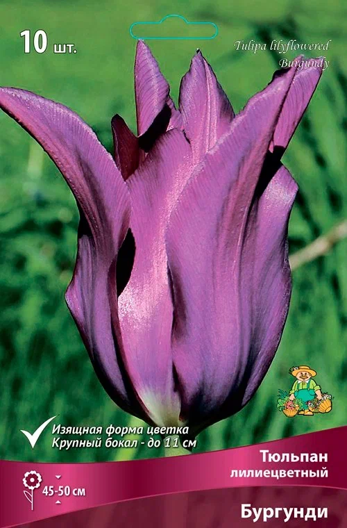 Лилиецветные тюльпаны - тюльпаны этого класса легко узнаваемы, так как своей формой напоминают цветок лилии — изящные бокалы с отгибающимися наружу и заостренными на концах лепестками. Лилиецветные тюльпаны довольно высокорослы (до 50-60 см в высоту), имеют крепкие цветоносы и цветы разнообразной окраски. Цветут во второй половине мая и, несмотря на свою немногочисленность, широко используются для озеленения садов и парков, для срезки, а некоторые сорта пригодны для выгонки. Бургунди - высота растения 45-50 см, цветок темно-вишневый. Местоположение: участок должен быть расположен в солнечном месте и защищен от ветра. Важно, чтобы он не имел неровностей, в которых весной и осень будет застаиваться вода - это может привести к вымоканию и загниванию луковиц. Почва: тюльпаны - растения довольно неприхотливые и могут мириться с любой садовой почвой, но наилучшей для них является рыхлая, хорошо дренированная, умеренно увлажненная, т.е. суглинистая и супесчаная почва с нейтральной или слабощелочной реакцией. Тяжелую суглинистую почву можно улучшить добавлением песка и торфа. Посадка: тюльпаны высаживают осенью, когда температура почвы на глубине 10 см опустится до 9-10 °С, в средней полосе это вторая половина сентября - начало октября. Глубина посадки для садовых тюльпанов – 15-20 см, ботанических -10 см. Расстояние между растениями 10-20 см. Луковицы садовых тюльпанов нужно выкапывать каждый год. Место посадки тюльпанов лучше менять 1 раз в 4-5 лет. Использование: для озеленения, на срезку.