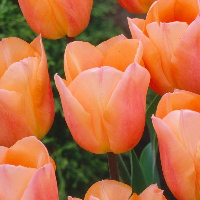 Триумф-тюльпаны - для тюльпанов этого класса характерны крупные бокаловидные цветки, довольно высокие цветоносы (40-70см) и хороший коэффициент размножения. Окраска цветов у тюльпанов этого класса самая разнообразная: от чисто-белой до темно-фиолетовой. Цветут Триумф-тюльпаны в конце апреля - начале мая, довольно продолжительное время и хорошо сохраняют форму бокала. Применяют тюльпаны данного класса довольно широко: на срезку, для оформления садов и парков, для выгонки в средние и поздние сроки. В настоящее время это самый многочисленный класс тюльпанов. Эприкот Бьюти - высота растения 40 см, цветок нежно-розово-абрикосовый. Местоположение: участок должен быть расположен в солнечном месте и защищен от ветра. Важно, чтобы он не имел неровностей, в которых весной и осень будет застаиваться вода - это может привести к вымоканию и загниванию луковиц. Почва: тюльпаны - растения довольно неприхотливые и могут мириться с любой садовой почвой, но наилучшей для них является рыхлая, хорошо дренированная, умеренно увлажненная, т.е. суглинистая и супесчаная почва с нейтральной или слабощелочной реакцией. Тяжелую суглинистую почву можно улучшить добавлением песка и торфа. Посадка: тюльпаны высаживают осенью, когда температура почвы на глубине 10 см опустится до 9-10°С, в средней полосе это вторая половина сентября - начало октября. Глубина посадки для садовых тюльпанов – 15-20см, ботанических -10см. Расстояние между растениями 10-20см. Луковицы садовых тюльпанов нужно выкапывать каждый год. Место посадки тюльпанов лучше менять 1 раз в 4-5 лет. Размножение: луковицами-детками при выкапывании. Использование: для озеленения, на срезку.